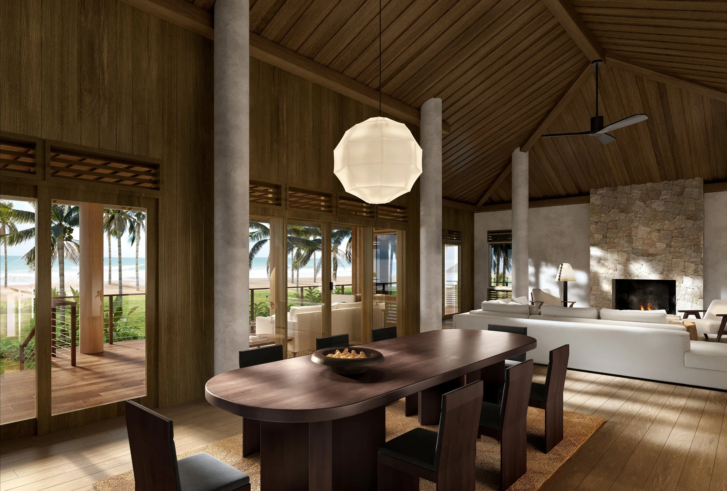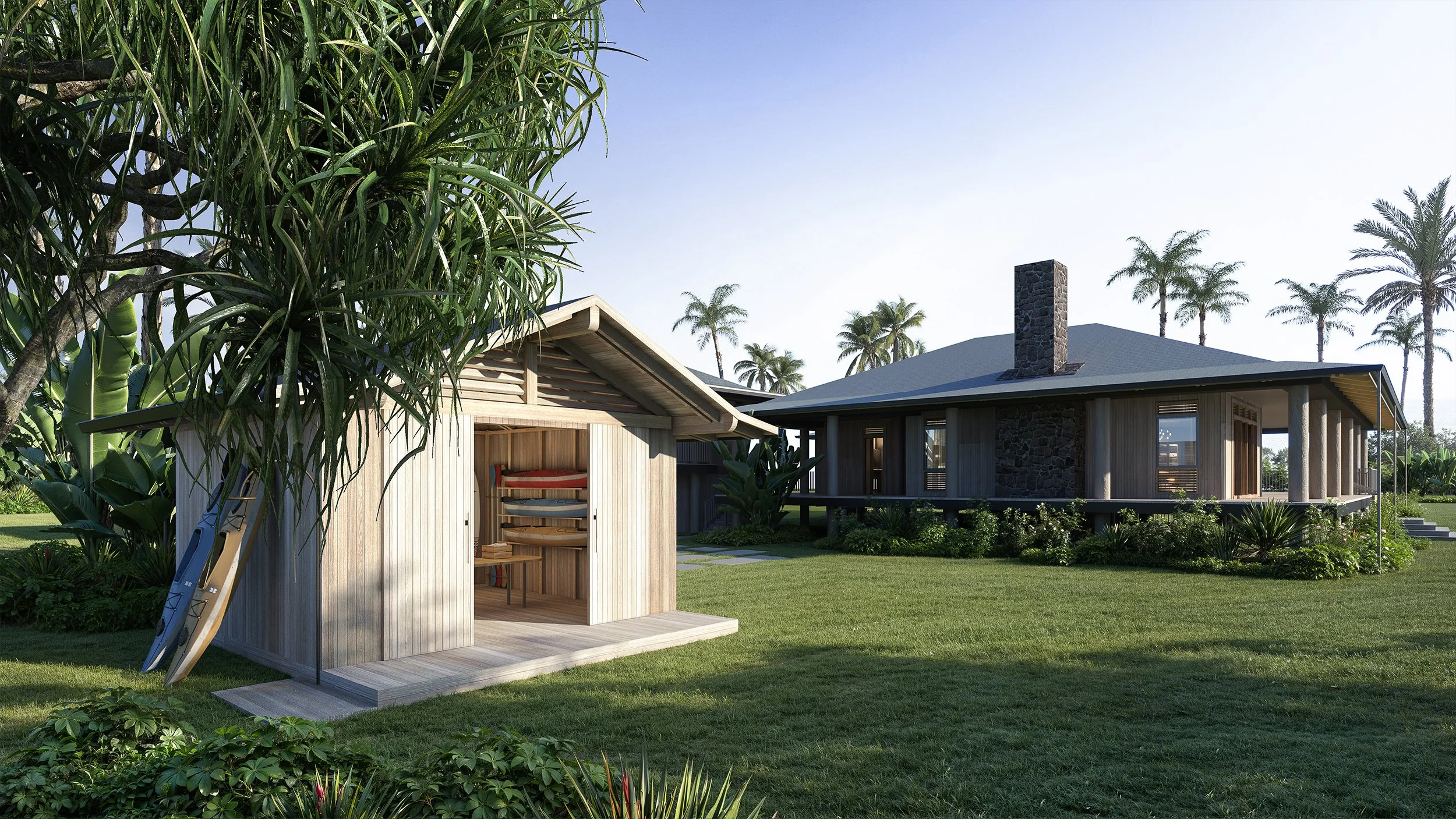 Inside, expansive gathering spaces flow seamlessly to outdoor terraces, where the ocean becomes a constant backdrop. Interiors are warm yet restrained, with layered textures and custom furnishings that balance comfort with refinement. Every element, from the surf shack to the main living pavilion, was considered to create a retreat that feels timeless, relaxed, and deeply connected to Kauai’s landscape.
